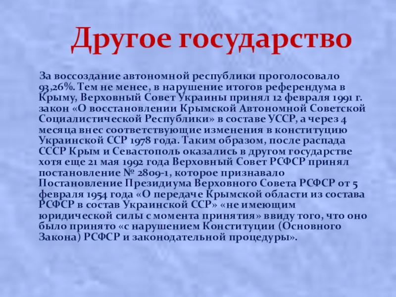93,26%. Тем не менее, в нарушение итогов референдума в Крыму, Верховный Совет Украины принял 12 февраля 1991 г. закон «О восстановлении Крымской Автономной Советской Социалистической Республики» в составе УССР, а через 4 месяца внес соответствующие изменения в конституцию Украинской ССР 1978 года. Таким образом, после распада СССР Крым и Севастополь оказались в другом государстве хотя еще 21 мая 1992 года Верховный Совет РСФСР принял постановление № 2809-1, которое признавало Постановление Президиума Верховного Совета РСФСР от 5 февраля 1954 года «О передаче Крымской области из состава РСФСР в состав Украинской ССР» «не имеющим юридической силы с момента принятия» ввиду того, что оно было принято «с нарушением Конституции (Основного Закона) РСФСР и законодательной процедуры».