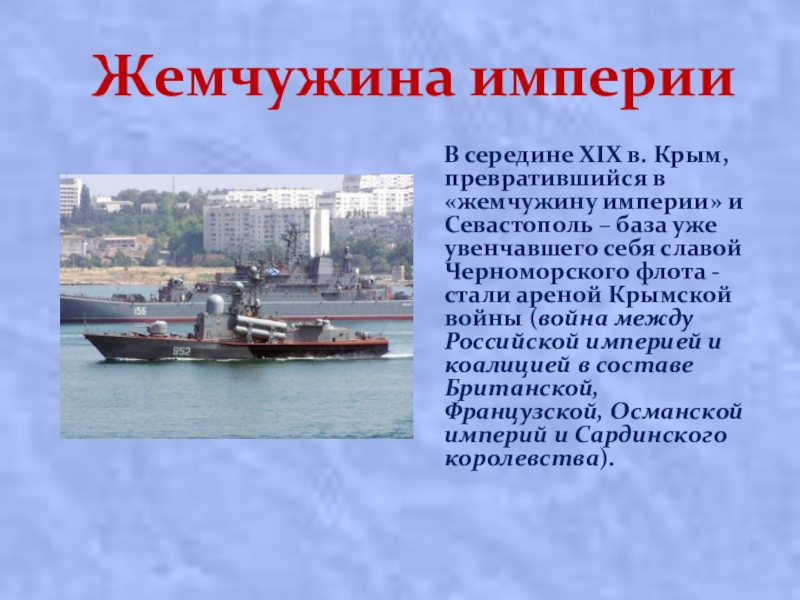 в «жемчужину империи» и Севастополь – база уже увенчавшего себя славой Черноморского флота - стали ареной Крымской войны (война между Российской империей и коалицией в составе Британской, Французской, Османской империй и Сардинского королевства).