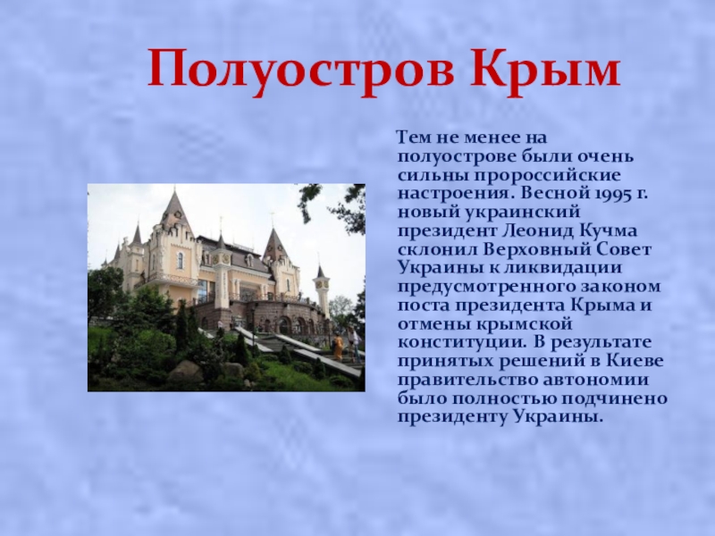 были очень сильны пророссийские настроения. Весной 1995 г. новый украинский президент Леонид Кучма склонил Верховный Совет Украины к ликвидации предусмотренного законом поста президента Крыма и отмены крымской конституции. В результате принятых решений в Киеве правительство автономии было полностью подчинено президенту Украины.