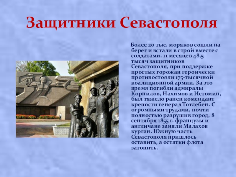 берег и встали в строй вместе с солдатами. 11 месяцев 48,5 тысяч защитников Севастополя, при поддержке простых горожан героически противостояли 175-тысячной коалиционной армии. За это время погибли адмиралы Корнилов, Нахимов и Истомин, был тяжело ранен комендант крепости генерал Тотлебен. С огромными трудами, почти полностью разрушив город, 8 сентября 1855 г. французы и англичане заняли Малахов курган. Южную часть Севастополя пришлось оставить, а остатки флота затопить.