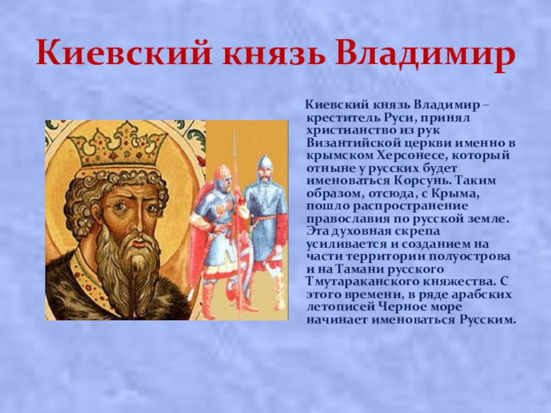 принял христианство из рук Византийской церкви именно в крымском Херсонесе, который отныне у русских будет именоваться Корсунь. Таким образом, отсюда, с Крыма, пошло распространение православия по русской земле. Эта духовная скрепа усиливается и созданием на части территории полуострова и на Тамани русского Тмутараканского княжества. С этого времени, в ряде арабских летописей Черное море начинает именоваться Русским.
