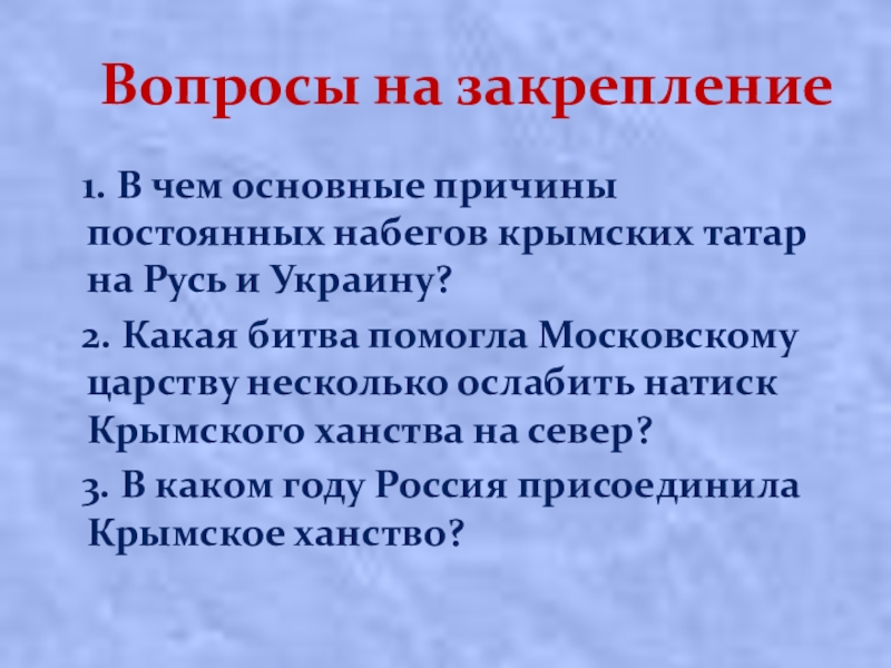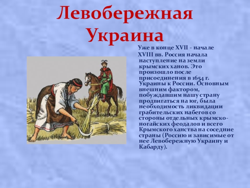 XVIII вв. Россия начала наступление на земли крымских ханов. Это произошло после присоединения в 1654 г. Украины к России. Основным внешним фактором, побуждавшим нашу страну продвигаться на юг, была необходимость ликвидации грабительских набегов со стороны отдельных крымско-ногайских феодалов и всего Крымского ханства на соседние страны (Россию и зависимые от нее Левобережную Украину и Кабарду).