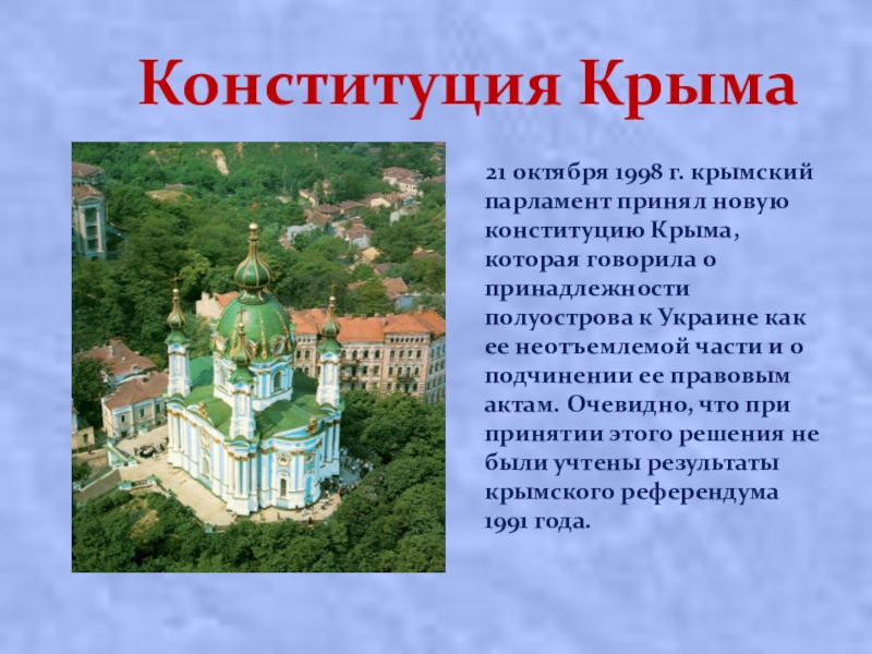 парламент принял новую конституцию Крыма, которая говорила о принадлежности полуострова к Украине как ее неотъемлемой части и о подчинении ее правовым актам. Очевидно, что при принятии этого решения не были учтены результаты крымского референдума 1991 года.