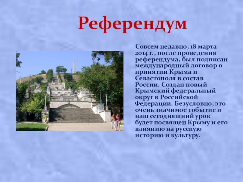 г., после проведения референдума, был подписан международный договор о принятии Крыма и Севастополя в состав России. Создан новый Крымский федеральный округ в Российской Федерации. Безусловно, это очень значимое событие и наш сегодняшний урок будет посвящен Крыму и его влиянию на русскую историю и культуру.