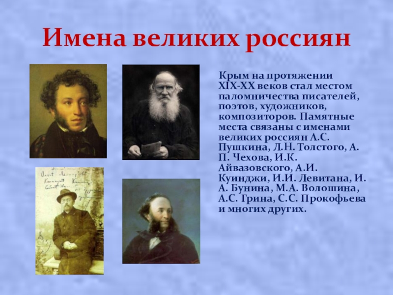 местом паломничества писателей, поэтов, художников, композиторов. Памятные места связаны с именами великих россиян А.С. Пушкина, Л.Н. Толстого, А.П. Чехова, И.К. Айвазовского, А.И. Куинджи, И.И. Левитана, И.А. Бунина, М.А. Волошина, А.С. Грина, С.С. Прокофьева и многих других.