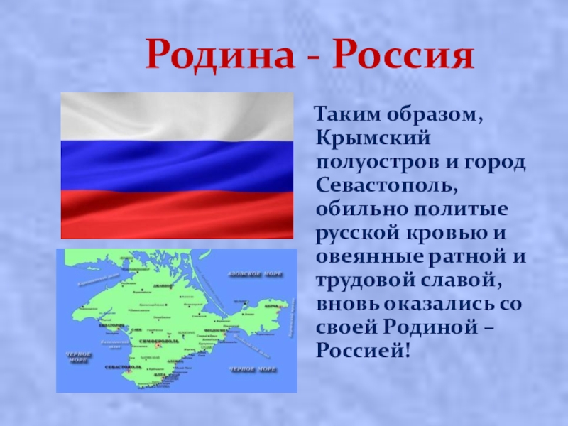 и город Севастополь, обильно политые русской кровью и овеянные ратной и трудовой славой, вновь оказались со своей Родиной – Россией!