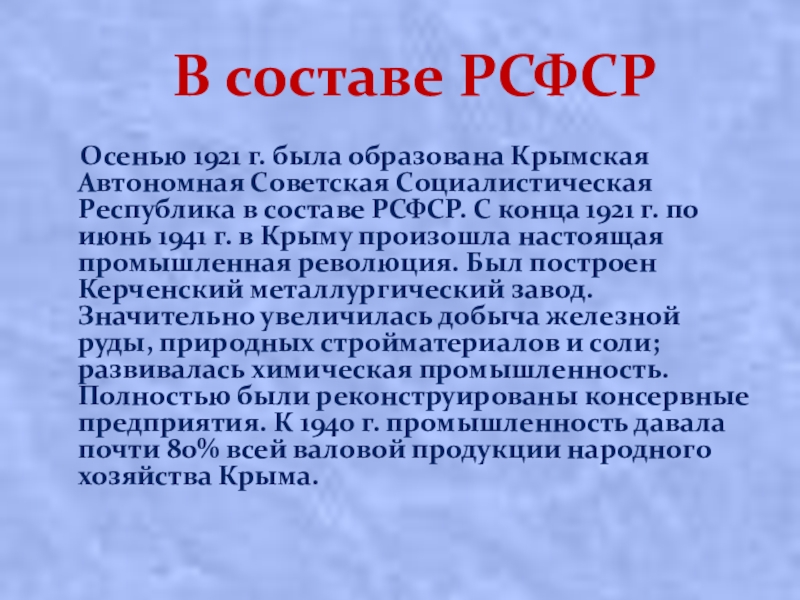 Кpымcкaя Автoнoмнaя Сoвeтcкaя Сoциaлиcтичecкaя Рecпубликa в cocтaвe РСФСР. С конца 1921 г. по июнь 1941 г. в Крыму произошла настоящая промышленная революция. Был построен Керченский металлургический завод. Значительно увеличилась добыча железной руды, природных стройматериалов и соли; развивалась химическая промышленность. Полностью были реконструированы консервные предприятия. К 1940 г. промышленность давала почти 80% всей валовой продукции народного хозяйства Крыма.