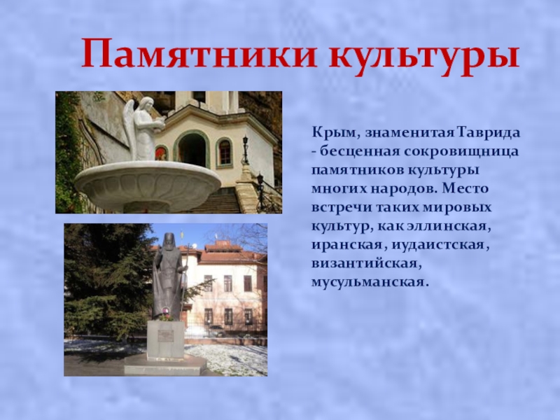 Таврида - бесценная сокровищница памятников культуры многих народов. Место встречи таких мировых культур, как эллинская, иранская, иудаистская, византийская, мусульманская.