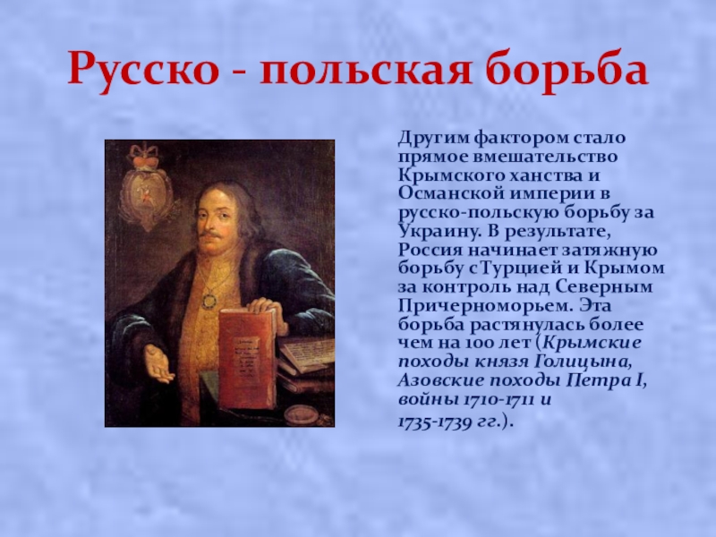 Крымского ханства и Османской империи в русско-польскую борьбу за Украину. В результате, Россия начинает затяжную борьбу с Турцией и Крымом за контроль над Северным Причерноморьем. Эта борьба растянулась более чем на 100 лет (Крымские походы князя Голицына, Азовские походы Петра I, войны 1710-1711 и