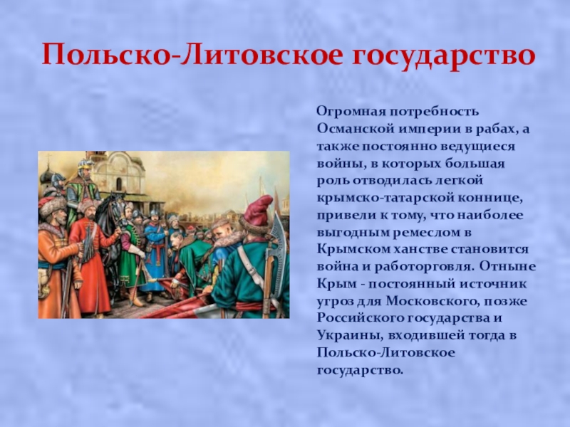также постоянно ведущиеся войны, в которых большая роль отводилась легкой крымско-татарской коннице, привели к тому, что наиболее выгодным ремеслом в Крымском ханстве становится война и работорговля. Отныне Крым - постоянный источник угроз для Московского, позже Российского государства и Украины, входившей тогда в Польско-Литовское государство.