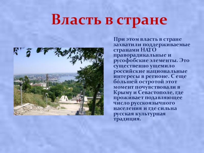 стране захватили поддерживаемые странами НАТО праворадикальные и русофобские элементы. Это существенно ущемило российские национальные интересы в регионе. С еще бóльшей остротой этот момент почувствовали в Крыму и Севастополе, где проживает подавляющее число русскоязычного населения и где сильна русская культурная традиция.