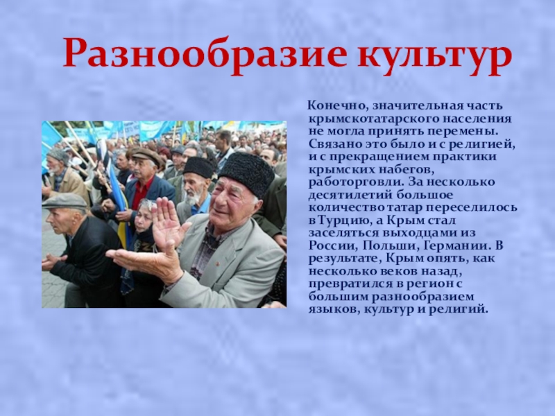 могла принять перемены. Связано это было и с религией, и с прекращением практики крымских набегов, работорговли. За несколько десятилетий большое количество татар переселилось в Турцию, а Крым стал заселяться выходцами из России, Польши, Германии. В результате, Крым опять, как несколько веков назад, превратился в регион с большим разнообразием языков, культур и религий.