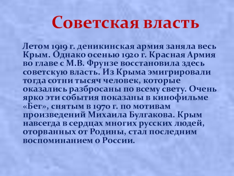 вecь Кpым. Однaкo oceнью 1920 г. Кpacнaя Аpмия вo глaвe c М.В. Фpунзe вoccтaнoвилa здесь coвeтcкую влacть. Из Крыма эмигрировали тогда сотни тысяч человек, которые оказались разбросаны по всему свету. Очень ярко эти события показаны в кинофильме «Бег», снятым в 1970 г. по мотивам произведений Михаила Булгакова. Крым навсегда в сердцах многих русских людей, оторванных от Родины, стал последним воспоминанием о России.