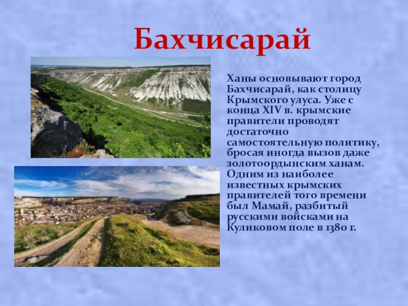 столицу Крымского улуса. Уже с конца XIV в. крымские правители проводят достаточно самостоятельную политику, бросая иногда вызов даже золотоордынским ханам. Одним из наиболее известных крымских правителей того времени был Мамай, разбитый русскими войсками на Куликовом поле в 1380 г.