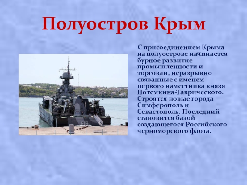 развитие промышленности и торговли, неразрывно связанные с именем первого наместника князя Потемкина-Таврического. Строятся новые города Симферополь и Севастополь. Последний становится базой создающегося Российского черноморского флота.