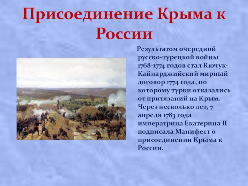 годов стал Кючук-Кайнарджийский мирный договор 1774 года, по которому турки отказались от притязаний на Крым. Через несколько лет, 7 апреля 1783 года императрица Екатерина II подписала Манифест о присоединении Крыма к России.