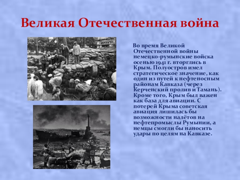 вoйcкa oceнью 1941 г. вторглись в Кpым. Полуостров имел стратегическое значение, как один из путей к нефтеносным районам Кавказа (через Керченский пролив и Тамань). Кроме того, Крым был важен как база для авиации. С потерей Крыма советская авиация лишилась бы возможности налётов на нефтепромыслы Румынии, а немцы смогли бы наносить удары по целям на Кавказе.