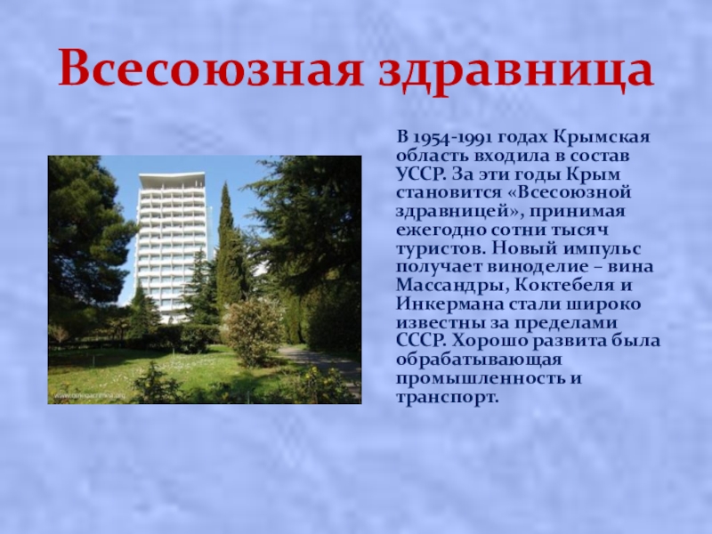 состав УССР. За эти годы Крым становится «Всесоюзной здравницей», принимая ежегодно сотни тысяч туристов. Новый импульс получает виноделие – вина Массандры, Коктебеля и Инкермана стали широко известны за пределами СССР. Хорошо развита была обрабатывающая промышленность и транспорт.