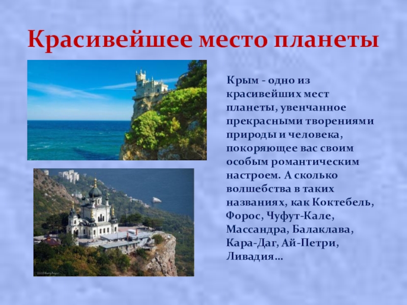 планеты, увенчанное прекрасными творениями природы и человека, покоряющее вас своим особым романтическим настроем. А сколько волшебства в таких названиях, как Коктебель, Форос, Чуфут-Кале, Массандра, Балаклава, Кара-Даг, Ай-Петри, Ливадия…