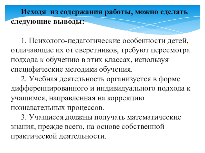 Слайд 10Исходя из содержания работы, можно сделать следующие выводы: