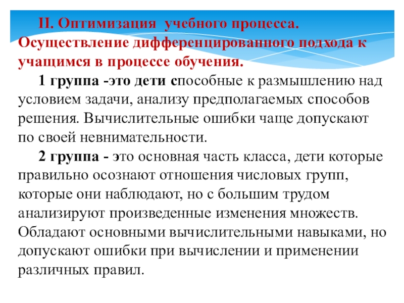 Слайд 7II. Оптимизация учебного процесса. Осуществление дифференцированного подхода к учащимся в процессе