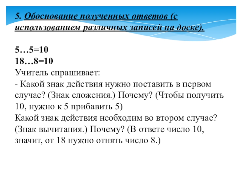 Какой знак действия нужно поставить в первом случае? (Знак сложения.) Почему? (Чтобы получить 10, нужно к 5 прибавить 5)
