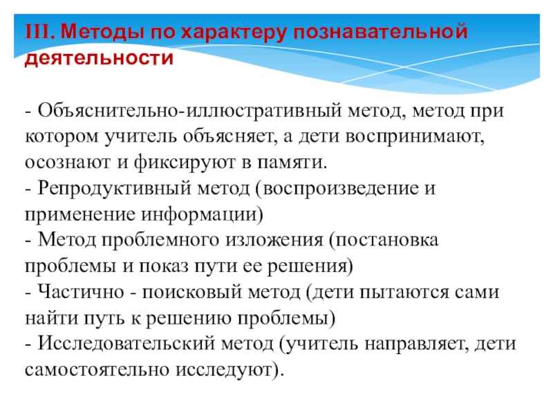 Слайд 9III. Методы по характеру познавательной деятельности
