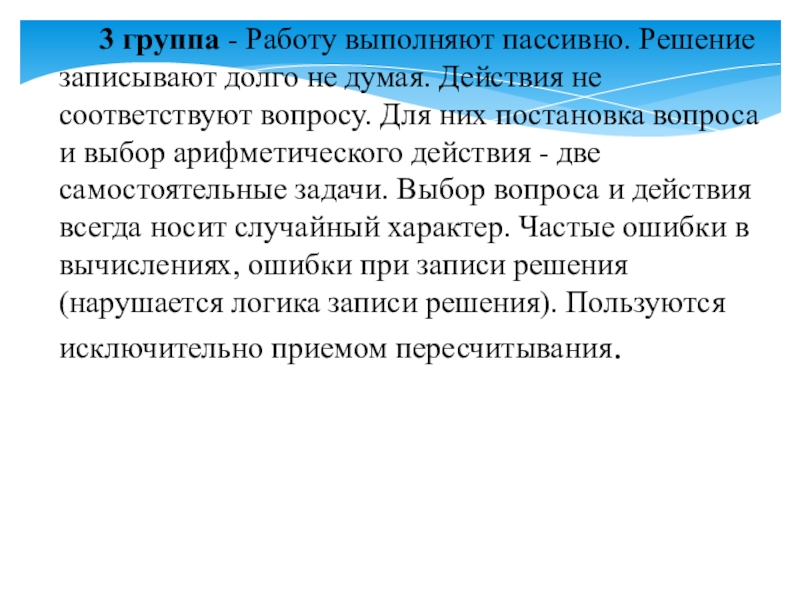 Слайд 8 3 группа - Работу выполняют пассивно. Решение записывают долго не думая.
