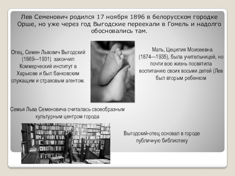 Лев Семенович родился 17 ноября 1896 в белорусском городке Орше, но уже через год Выгодские переехали в Гомель и надолго обосновались там.
