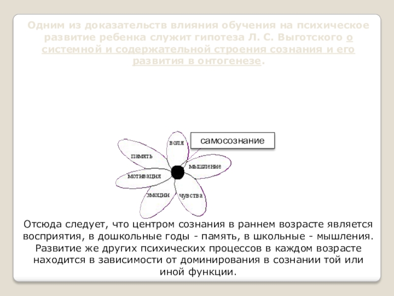 Отсюда следует, что центром сознания в раннем возрасте является восприятия, в дошкольные годы - память, в школьные - мышления. Развитие же других психических процессов в каждом возрасте находится в зависимости от доминирования в сознании той или иной функции.