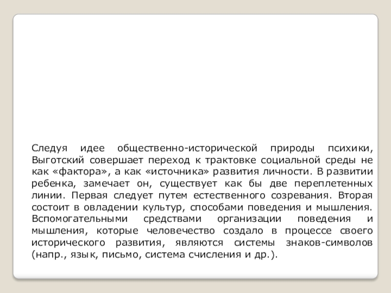 Следуя идее общественно-исторической природы психики, Выготский совершает переход к трактовке социальной среды не как «фактора», а как «источника» развития личности. В развитии ребенка, замечает он, существует как бы две переплетенных линии. Первая следует путем естественного созревания. Вторая состоит в овладении культур, способами поведения и мышления. Вспомогательными средствами организации поведения и мышления, которые человечество создало в процессе своего исторического развития, являются системы знаков-символов (напр., язык, письмо, система счисления и др.).