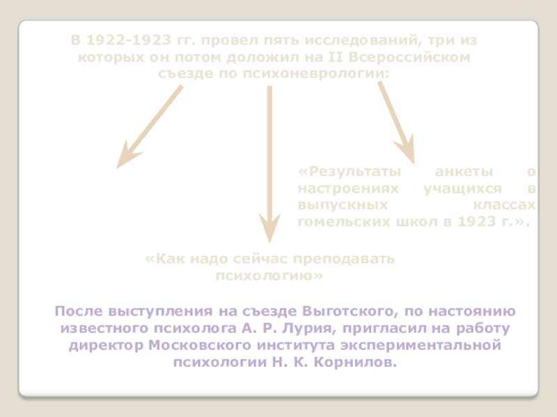 После выступления на съезде Выготского, по настоянию известного психолога А. Р. Лурия, пригласил на работу директор Московского института экспериментальной психологии Н. К. Корнилов.