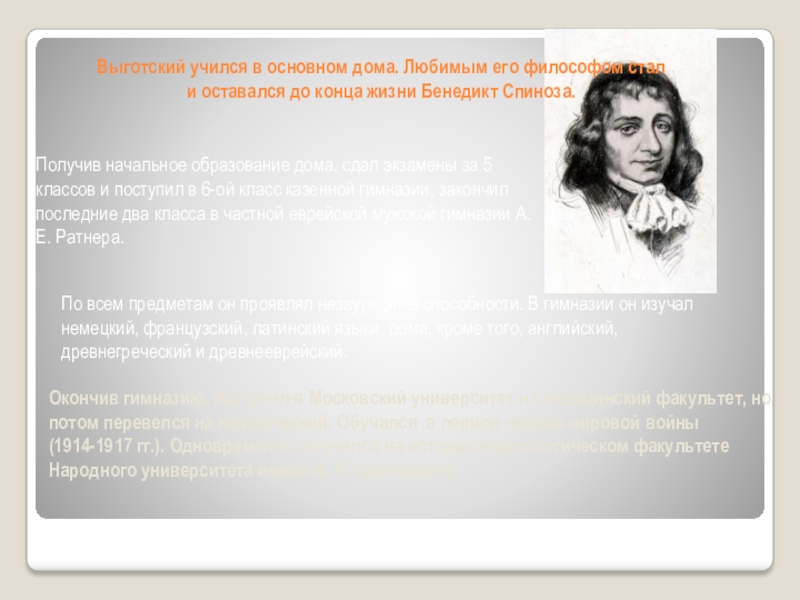 По всем предметам он проявлял незаурядные способности. В гимназии он изучал немецкий, французский, латинский языки, дома, кроме того, английский, древнегреческий и древнееврейский.