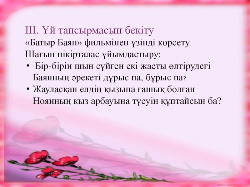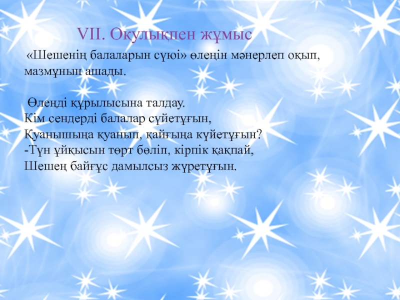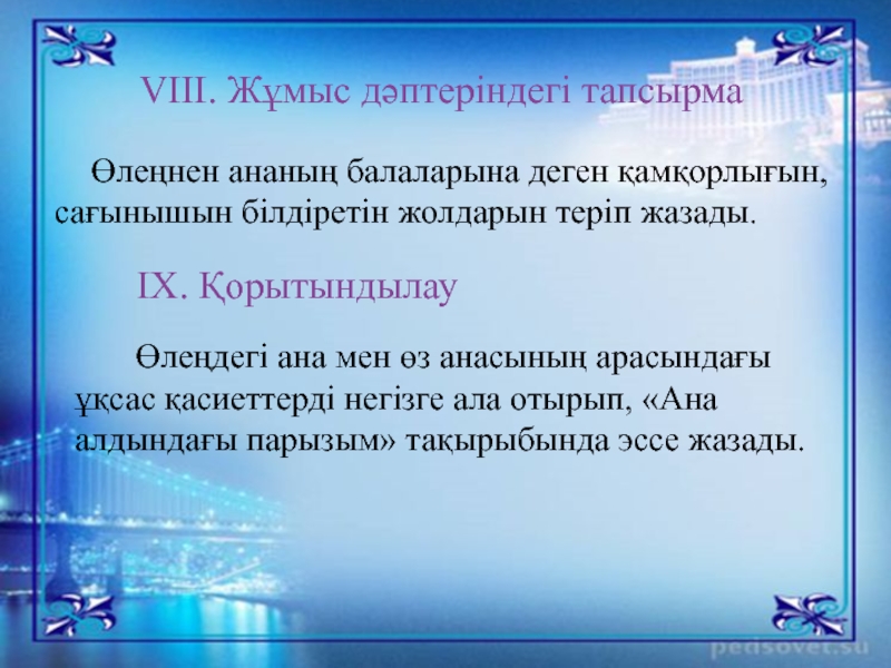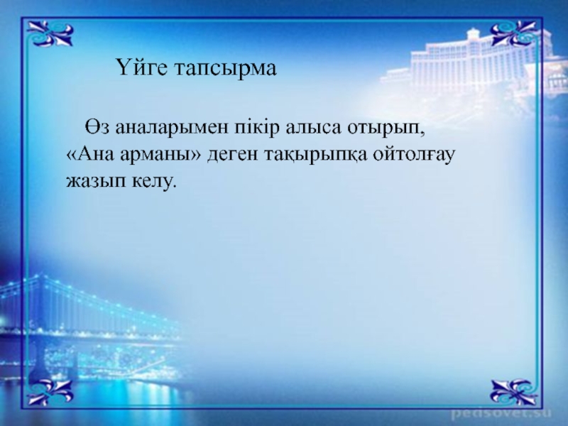 Өлеңдегі ана мен өз анасының арасындағы ұқсас қасиеттерді негізге ала отырып, «Ана алдындағы парызым» тақырыбында эссе жазады.