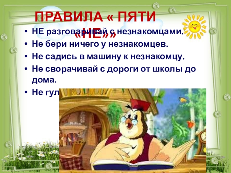 ПРАВИЛА « ПЯТИ «НЕ»»НЕ разговаривай с незнакомцами.Не бери ничего у незнакомцев.Не садись в машину к незнакомцу.Не сворачивай