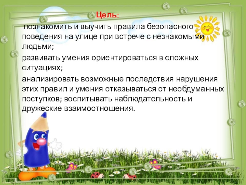 Цель: познакомить и выучить правила безопасного поведения на улице при встрече с незнакомыми людьми;развивать умения ориентироваться
