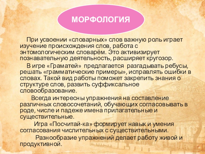 играет изучение происхождения слов, работа с энтомологическим словарём. Это активизирует познавательную деятельность, расширяет кругозор.