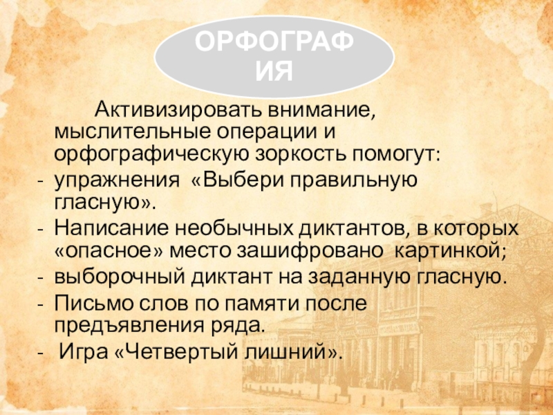 «усиленное утрированное» запоминание буквы в слове (орфографическое проговаривание), базирующегося на взаимодействии речедвигательного, кинестетического, тактильного, слухового анализаторов.