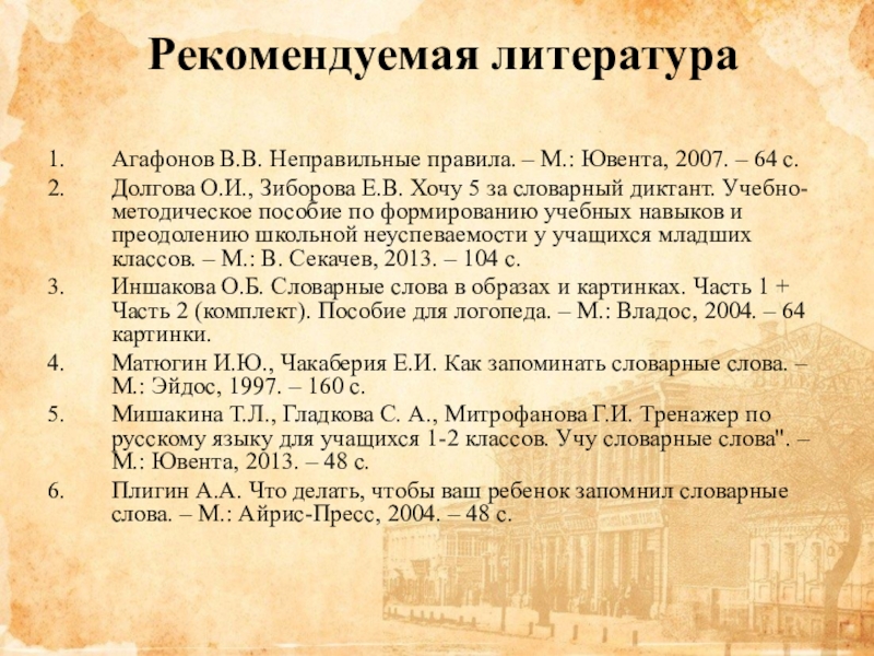 Плигин А.А. Что делать, чтобы ваш ребенок запомнил словарные слова. – М.: Айрис-Пресс, 2004. – 48 с.