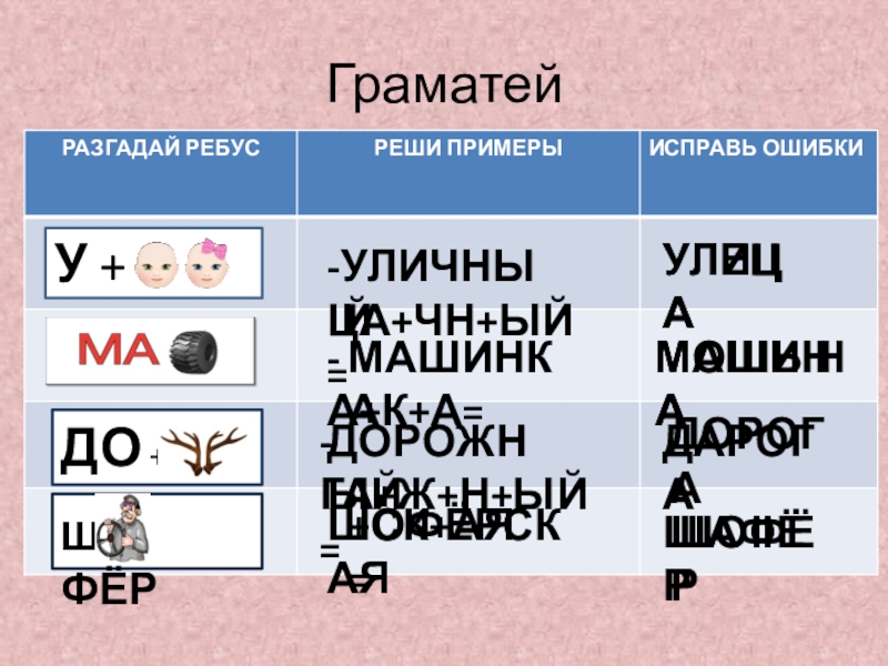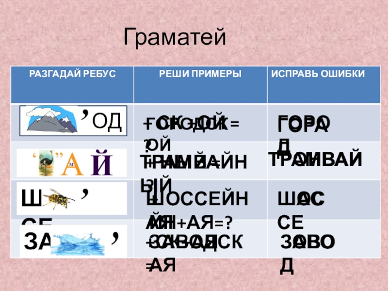 В игре «Граматей» предлагается разгадывать ребусы, решать «грамматические примеры», исправлять ошибки в словах. Такой вид работы поможет закрепить знания о структуре слов, развить суффиксальное словообразование.
