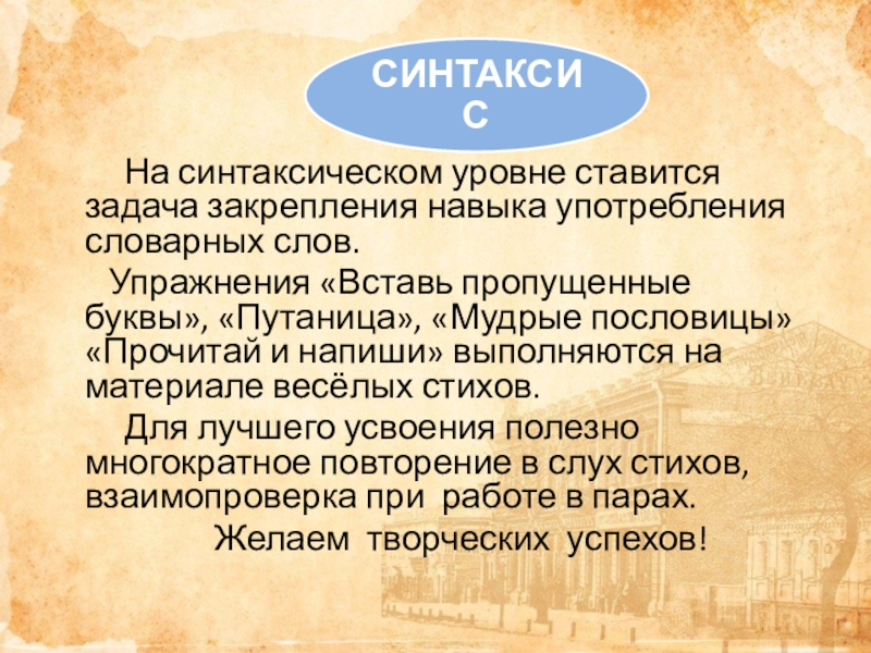 Это позволит обогатить лексику, расширить семантическое поле, сформировать лексико-грамматический строй речи, развить языковое чутье.
