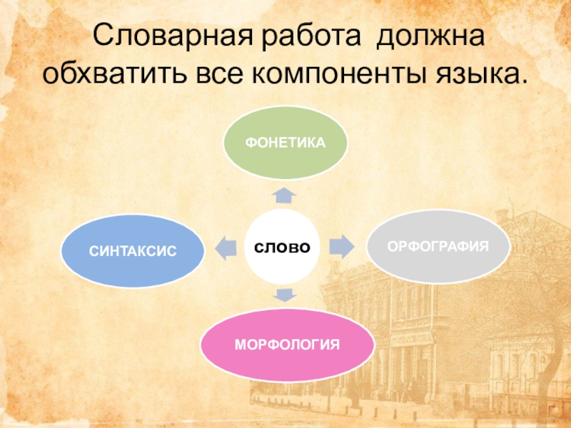 Слайд 4 Словарная работа должна обхватить все компоненты языка.