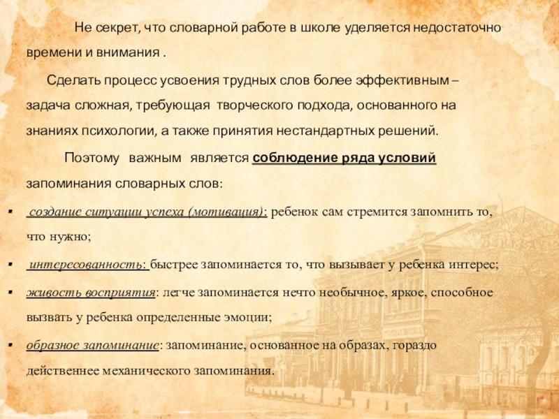 Поэтому важным является соблюдение ряда условий запоминания словарных слов: