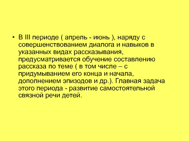 диалога и навыков в указанных видах рассказывания, предусматривается обучение составлению рассказа по теме ( в том числе – с придумыванием его конца и начала, дополнением эпизодов и др.). Главная задача этого периода - развитие самостоятельной связной речи детей.