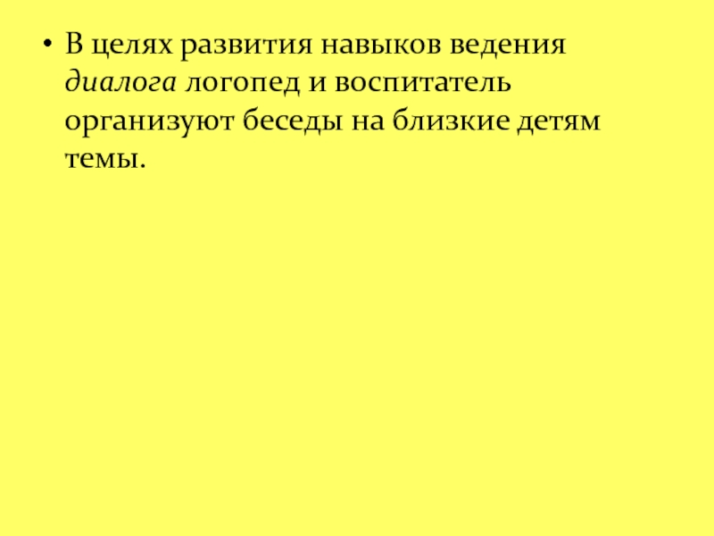 Слайд 16В целях развития навыков ведения диалога логопед и воспитатель организуют беседы