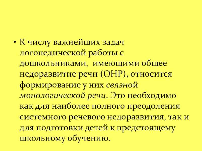 речи (ОНР), относится формирование у них связной монологической речи. Это необходимо как для наиболее полного преодоления системного речевого недоразвития, так и для подготовки детей к предстоящему школьному обучению.