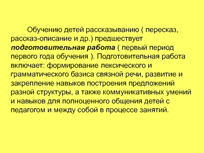 др.) предшествует подготовительная работа ( первый период первого года обучения ). Подготовительная работа включает: формирование лексического и грамматического базиса связной речи, развитие и закрепление навыков построения предложений разной структуры, а также коммуникативных умений и навыков для полноценного общения детей с педагогом и между собой в процессе занятий.