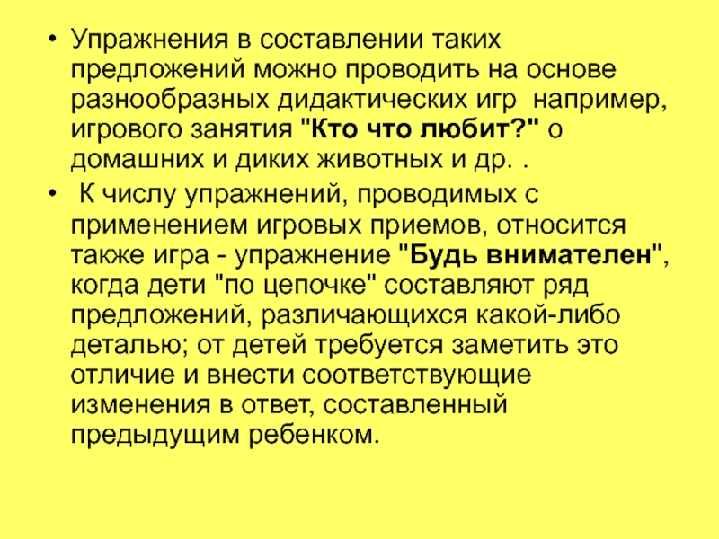 К числу упражнений, проводимых с применением игровых приемов, относится также игра - упражнение "Будь внимателен", когда дети "по цепочке" составляют ряд предложений, различающихся какой-либо деталью; от детей требуется заметить это отличие и внести соответствующие изменения в ответ, составленный предыдущим ребенком.