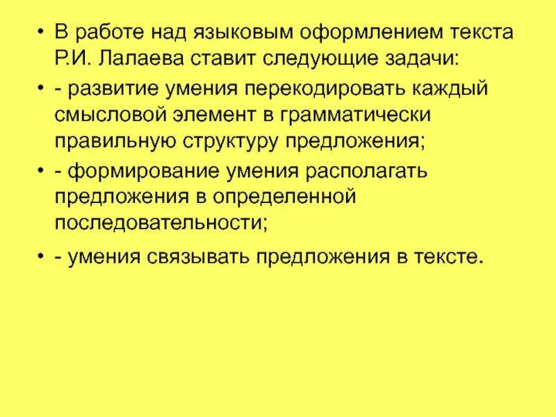 Слайд 20В работе над языковым оформлением текста Р.И. Лалаева ставит следующие задачи: