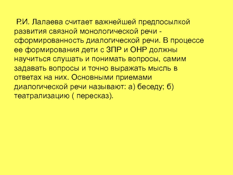 Р.И. Лалаева считает важнейшей предпосылкой развития связной монологической речи -